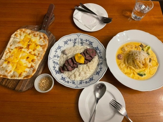 스테이크와 파스타, 그리고 갈릭 라이스의 완벽한 조합
