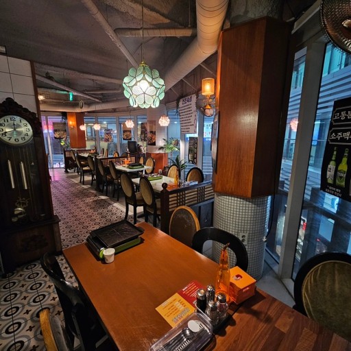 식당 내부는 레트로한 감성으로 꾸며져 있어 편안한 분위기에서 식사를 즐길 수 있습니다. 노란색 불빛과 자개장, 오래된 TV 등 소품들이 추억을 불러일으키며, 레트로한 음악이 흘러나와 더욱 분위기 있는 식사를 제공합니다. 직원들은 친절하게 고기에 대한 설명을 해주며, 초벌로 구워진 고기를 제공해 편리하게 식사를 즐길 수 있습니다.