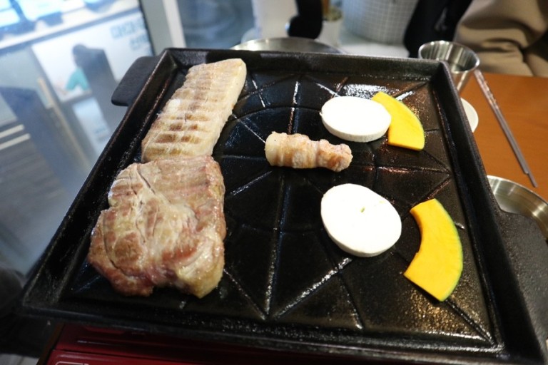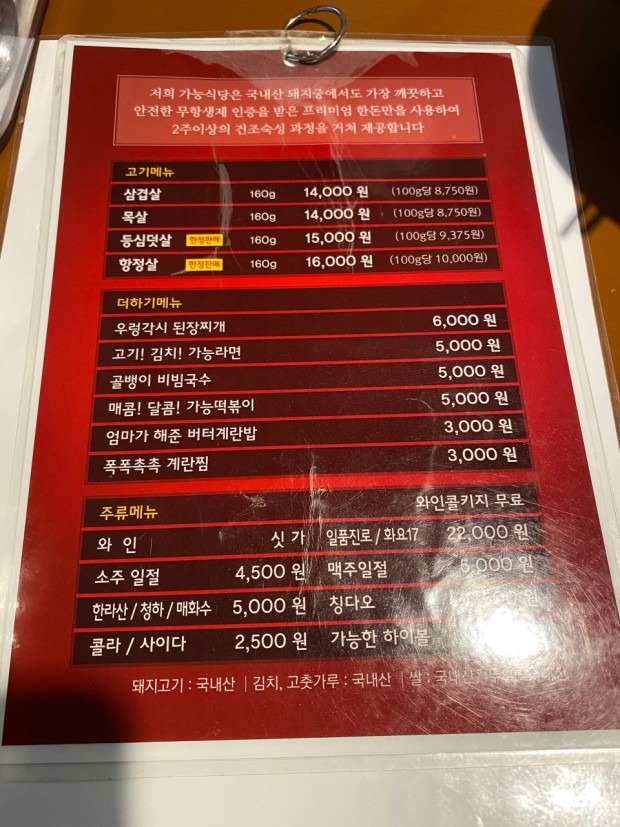가능식당은 드라이에이징 삼겹살과 덧살을 포함한 다양한 고기 요리를 제공합니다. 특히 드라이에이징 과정을 거친 고기는 부드럽고 쫄깃한 식감이 일품입니다. 기본 반찬으로 제공되는 백김치, 파절임, 깻잎장아찌 등은 고기와 잘 어울리며, 올리브 마늘소스는 특히 고기 맛을 한층 더해줍니다. 고기뿐만 아니라 간장 버터 계란밥, 우렁 된장찌개, 옛날 고기짜장면 등 다양한 사이드 메뉴도 함께 즐길 수 있습니다.