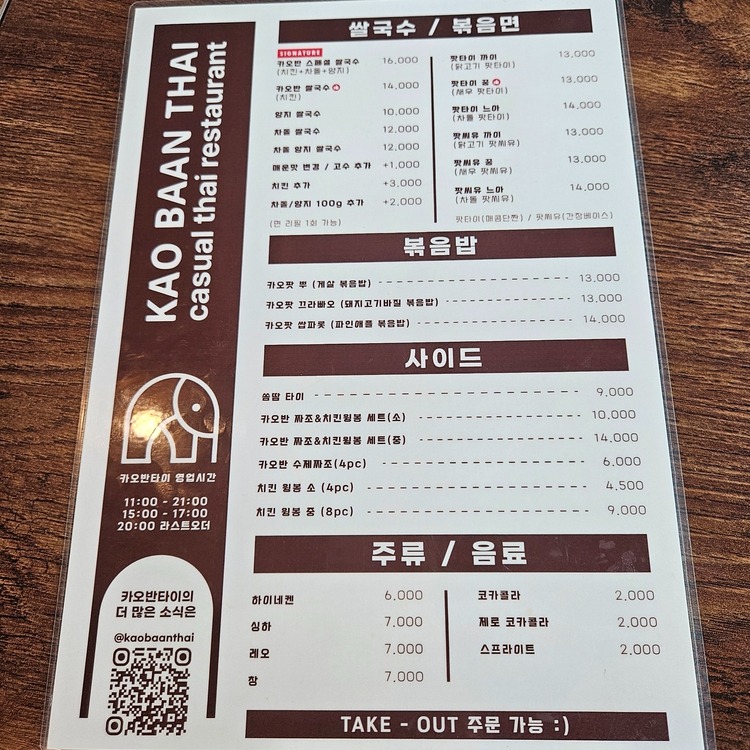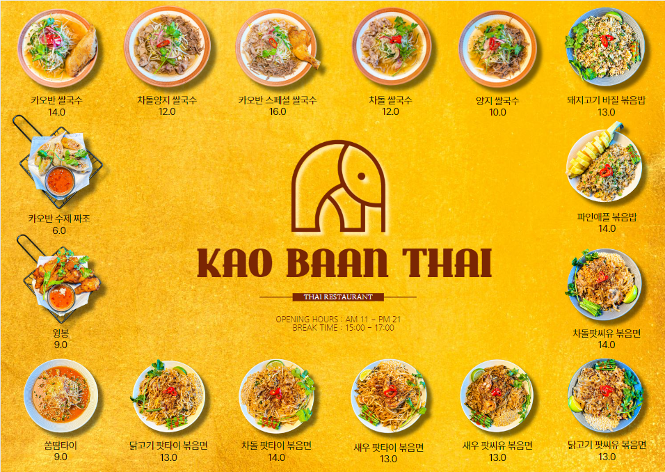 카오반타이의 메뉴는 태국 음식 애호가라면 꼭 한 번 시도해봐야 할 다양한 선택지들이 많습니다. 제가 방문해보고 추천하는 몇 가지 인기 메뉴는 다음과 같습니다.