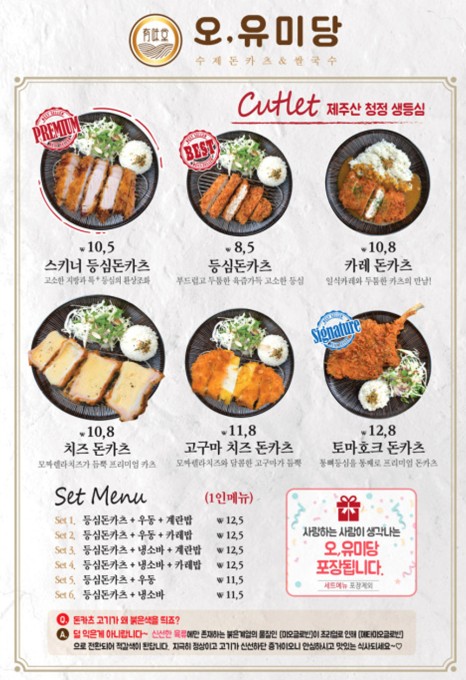 오유미당 마곡점은 풍성한 메뉴 선택지로 고객들에게 다양한 맛을 제공합니다. 대표 메뉴인 무지개 돈카츠는 다채로운 색상과 함께 독특한 비주얼로 눈길을 끕니다. 이 돈카츠는 바삭한 튀김옷 안에 촉촉한 고기가 담겨 있어 첫 입부터 만족감을 줍니다. 모짜쭈욱 치즈 돈카츠는 모짜렐라 치즈가 쭉쭉 늘어나며 고소한 맛을 자랑합니다. 치즈의 짭조름한 맛과 돈카츠의 부드러운 식감이 조화를 이루어 치즈를 좋아하는 사람들에게 인기가 많습니다. 또한, 통뼈 돈마호크 돈카츠는 애니메이션에 나올법한 비주얼로 뼈에 붙은 고기의 진한 맛을 즐길 수 있습니다. 불향 가득 순두부 짬뽕 쌀국수는 돈카츠와 잘 어울리는 매콤한 국물 요리로, 순두부와 차돌양지가 듬뿍 들어가 있어 든든한 한 끼 식사가 됩니다. 그 외에도 돈카츠 덮밥, 냉소바, 우동 등 다양한 메뉴가 준비되어 있어 누구나 만족할 수 있는 선택지를 제공합니다.