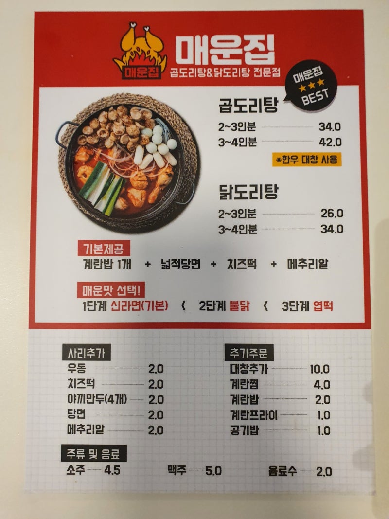 '매운집'의 대표 메뉴는 곱도리탕과 닭도리탕입니다. 곱도리탕은 부드러운 닭고기와 쫄깃한 한우 대창이 매콤한 양념에 잘 어우러진 요리로, 첫 맛은 맵지만 곧이어 깊은 감칠맛이 느껴집니다. 닭도리탕은 촉촉한 닭고기에 감자, 당근 등 다양한 야채가 듬뿍 들어가 있어 더욱 풍성한 맛을 자랑합니다. 매운맛은 1단계부터 3단계까지 선택할 수 있어, 매운 음식을 잘 못 먹는 사람도 부담 없이 즐길 수 있습니다. 특히, 매운맛을 중화시켜주는 계란찜과 함께 먹으면 더욱 맛있습니다. 계란찜은 부드럽고 고소하며, 참기름과 깨가 듬뿍 뿌려져 있어 그 자체로도 훌륭한 사이드 메뉴입니다.