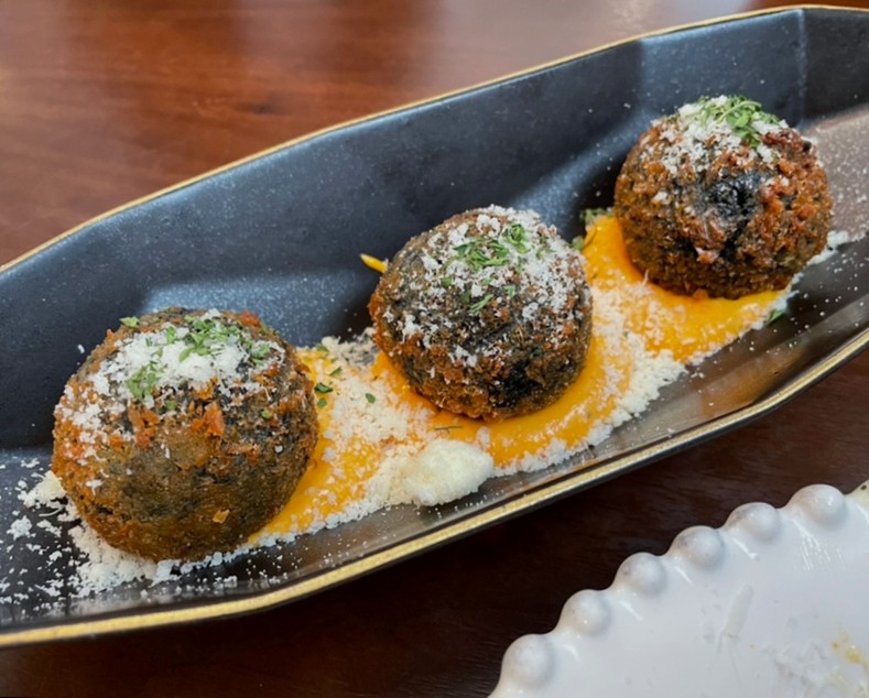 먹물 아란치니는 또 다른 인기 메뉴로, 한치와 모짜렐라 치즈가 듬뿍 들어간 밥을 바삭하게 튀겨낸 요리입니다. 바삭한 겉과 부드러운 속이 조화를 이루며, 먹물 소스의 풍미가 입안 가득 퍼집니다. 약간의 매콤함이 더해져 느끼함 없이 깔끔한 맛을 즐길 수 있습니다.