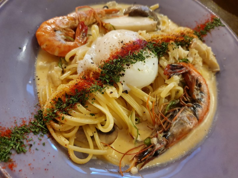 수란&쉬림프 매콤 크림파스타는 부드러운 크림소스와 매콤한 맛이 완벽하게 어우러진 메뉴입니다. 큼지막한 새우와 수란이 올라가 있어 비주얼도 뛰어나며, 고춧가루가 더해져 매콤한 맛을 더욱 강조합니다. 크림소스와 수란의 부드러움이 매콤함과 조화를 이루어 입맛을 돋우는 이 파스타는 많은 고객들의 사랑을 받고 있습니다.