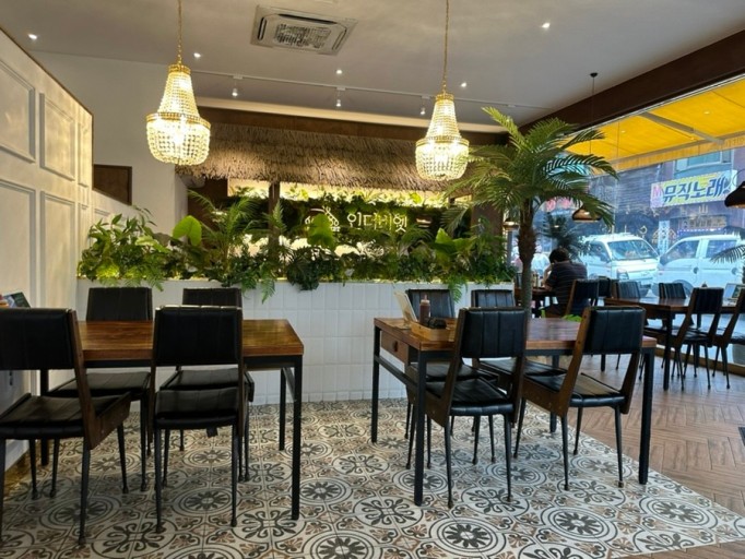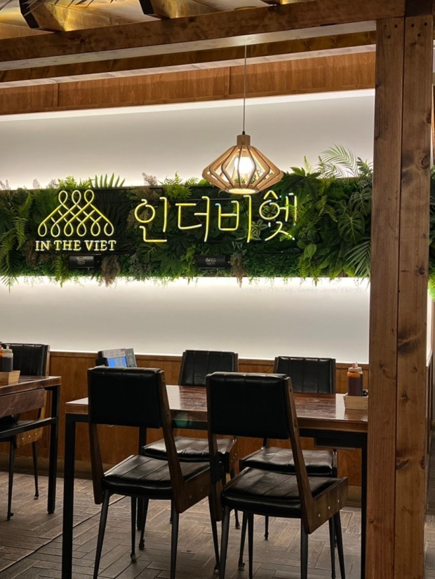 인더비엣 범계점의 첫인상은 깔끔하고 넓은 공간이었습니다. 내부는 푸릇푸릇한 식물들로 장식되어 있어 베트남 현지의 느낌을 살렸으며, 테이블 간격도 넉넉해 편안한 식사가 가능했습니다. 아이들과 함께 방문해도 좋은 분위기였으며, 직원들의 친절한 서비스가 인상적이었습니다. 특히 유리그릇을 사용하여 음식이 더욱 깔끔하게 보였다는 점도 마음에 들었습니다.