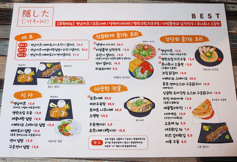 카쿠시타는 맛있는 음식과 아늑한 분위기로 연남동을 찾는 이들에게 꼭 추천하고 싶은 곳입니다. 특히 연남카츠, 명란크림우동, 모츠나베는 이곳에서만 맛볼 수 있는 특별한 메뉴들로, 각각의 독특한 맛과 조화를 이루어 방문객들에게 큰 만족감을 줍니다. 점심에는 가볍게 식사를, 저녁에는 한 잔의 술과 함께 오붓한 시간을 보낼 수 있는 이자카야로, 번잡한 도시 생활에서 벗어나 한적한 시간을 보내고 싶다면 카쿠시타를 방문해 보세요. 단, 인기가 많아 웨이팅이 있을 수 있으니 예약은 필수입니다.
