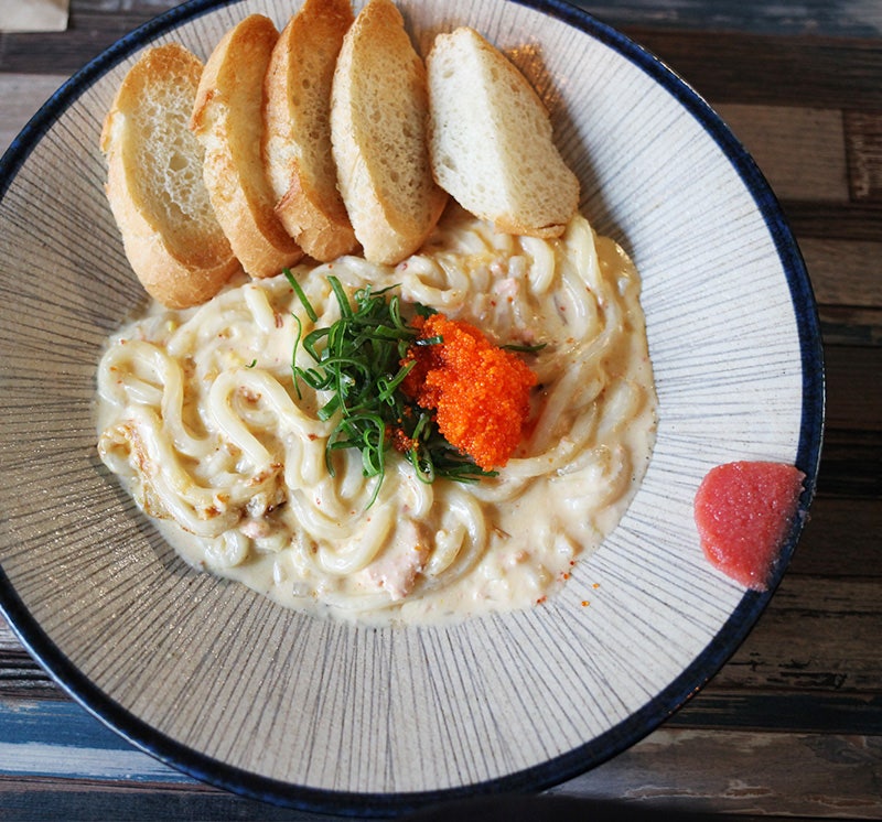 명란크림우동은 카쿠시타에서 꼭 맛봐야 할 또 다른 인기 메뉴입니다. 꾸덕한 크림 소스와 짭조름한 명란이 어우러져 고소하면서도 감칠맛이 나는 이 우동은 바게트와 함께 제공되어 독특한 맛의 조합을 즐길 수 있습니다. 우동면의 쫄깃한 식감과 명란 알갱이의 터지는 식감이 입안에서 어우러지며, 크림소스는 느끼하지 않아 부담 없이 즐길 수 있습니다.