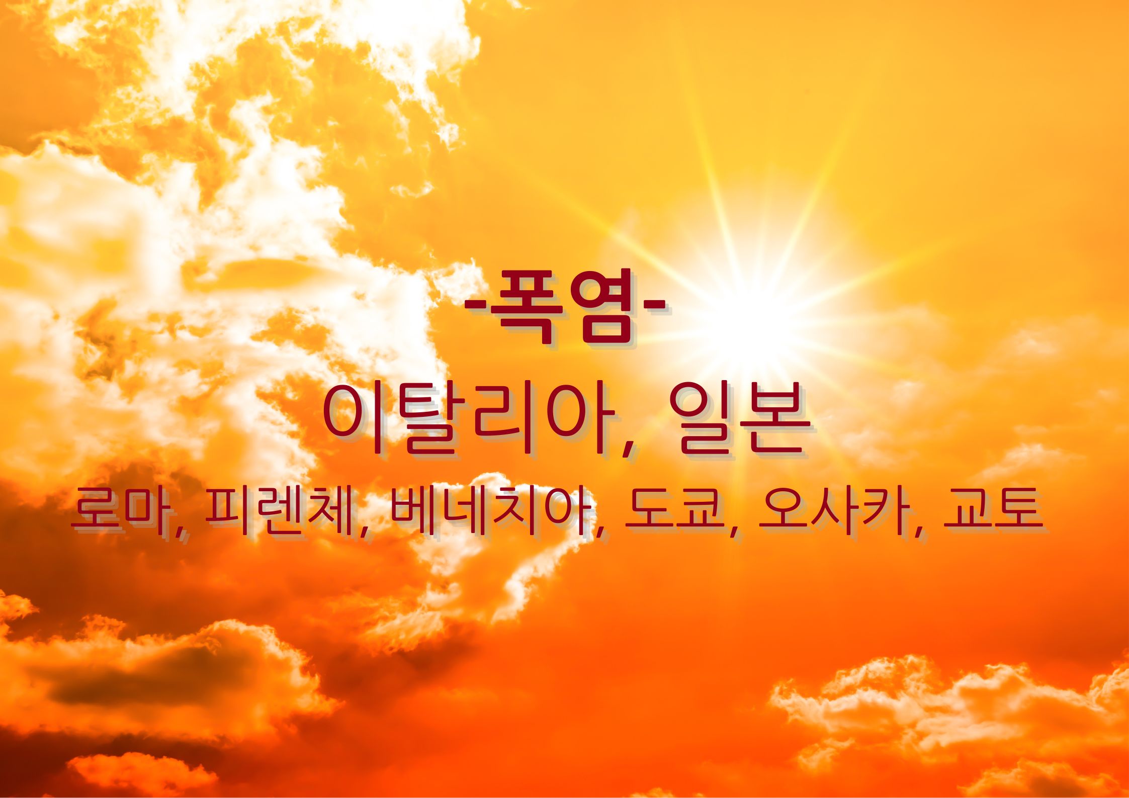 여름철에는 높은 기온으로 인해 여행을 즐기기 어려운 나라들도 있습니다. 대표적으로 이탈리아와 일본이 있는데, 이들 나라에서는 여름철 폭염이 심각한 문제로 대두되고 있습니다.