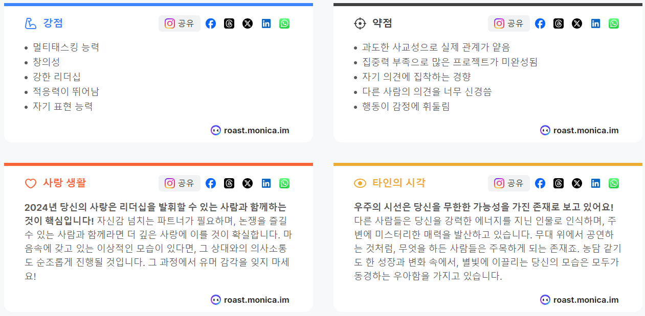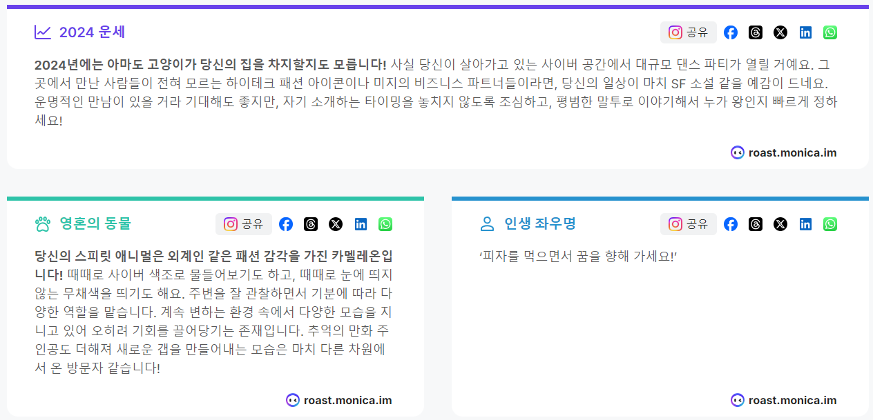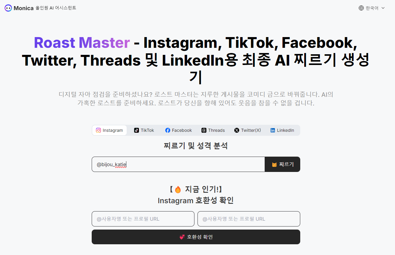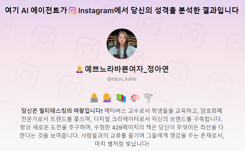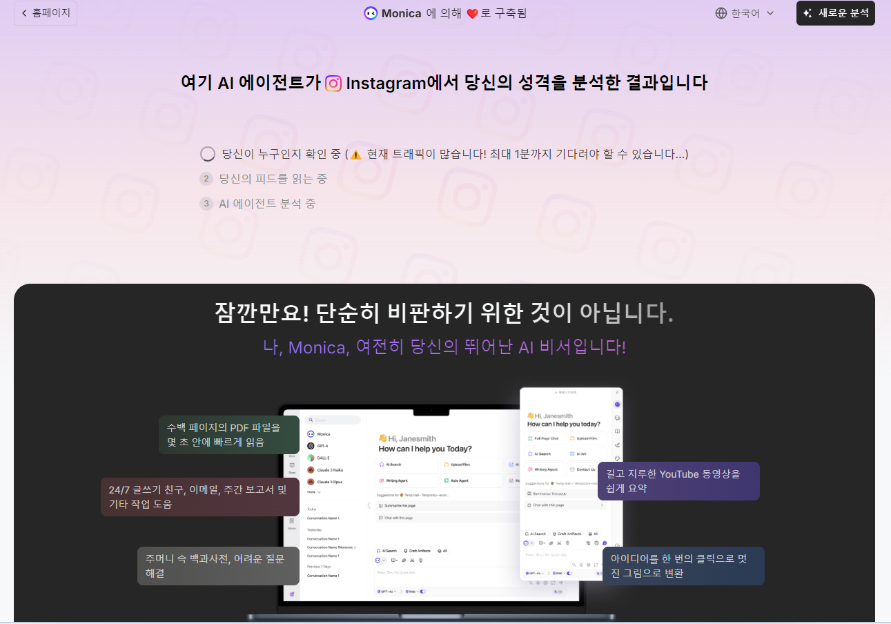 "Monica" AI 에이전트는 사용자의 인스타그램 활동을 분석하는데, 인공지능 모델을 이용해 콘텐츠를 분석하고, 이를 바탕으로 맞춤형 분석 결과를 제공합니다. 이러한 테스트는 소셜 미디어 사용자들 사이에서 큰 관심을 끌고 있으며, 특히 AI가 제공하는 맞춤형 분석 결과가 흥미를 자극하고 있습니다. 이는 단순한 계정 분석을 넘어, 사용자의 성격과 행동 패턴을 파악해 일종의 "로스트" 형식으로 재미있는 결과를 전달하는 점에서 유행하고 있습니다.